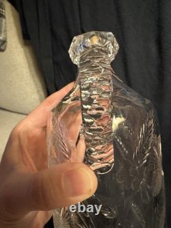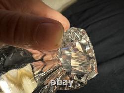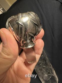 Minor faint mineral deposits to interior of glass. Faint fleabites/small chips to edges of glass stopper. Sterling in nice condition with only a faint short scratch or two. Measures overall 13 1/4" H x 4 3/8" x 3 3/8.