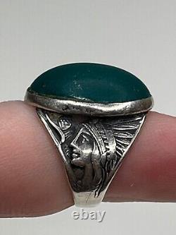 Antique Sterling Silver Green Glass Cabochon Native American Chief Ring