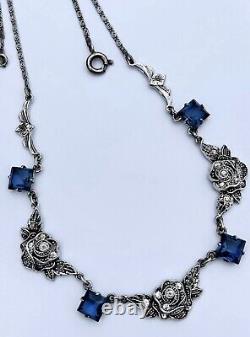 Art Deco Sterling Silver Floral Rose design Blue and Clear Glass rhinestones Delicate Chain Necklace. The necklace measures 16 inches long, set in an open back frame, the blue glass rhinestones are absolutely beautiful and the rose design with clear rhinestones. The closure is a spring ring clasp and in good vintage condition. Please view pictures for details and conditions. Not marked but acid tested.