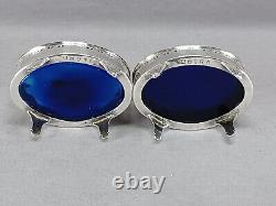 Robert Hennell I London Neoclassical Sterling Silver & Cobalt Glass Salts C. 1790 Nice pair of British sterling silver salts with openwork Neoclassical leaves and medallion. Marked with the passant lion, London mark, date code for 1790 and RH mark for Robert Hennell I. Has a few small dents to the silver and a some small flakes to the rim of the cut inserts, but otherwise good condition.
