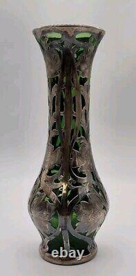Gorgeous art nouveau green glass vase encased in sterling silver by Alvin Mfg. Unfortunately it does have damage. It will NOT hold water.